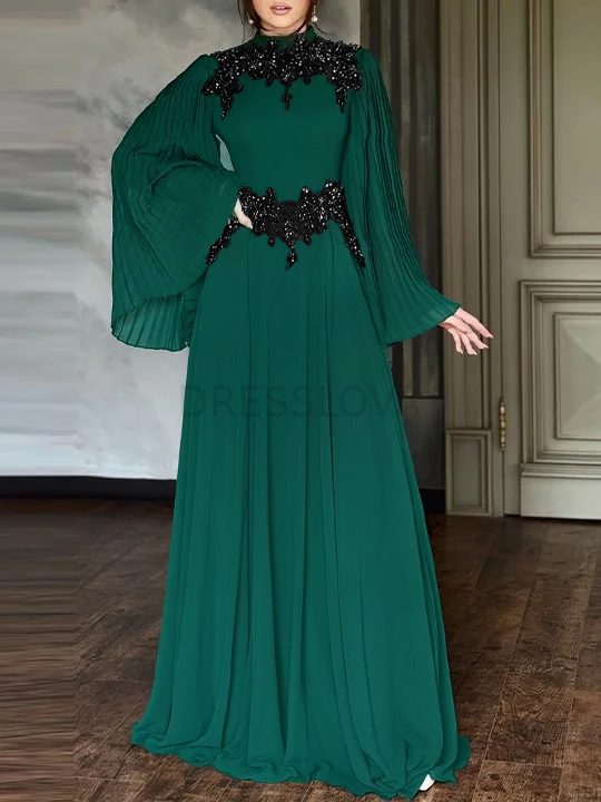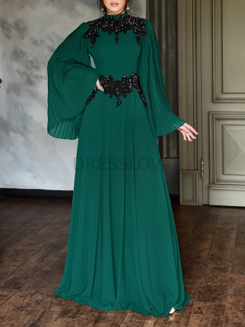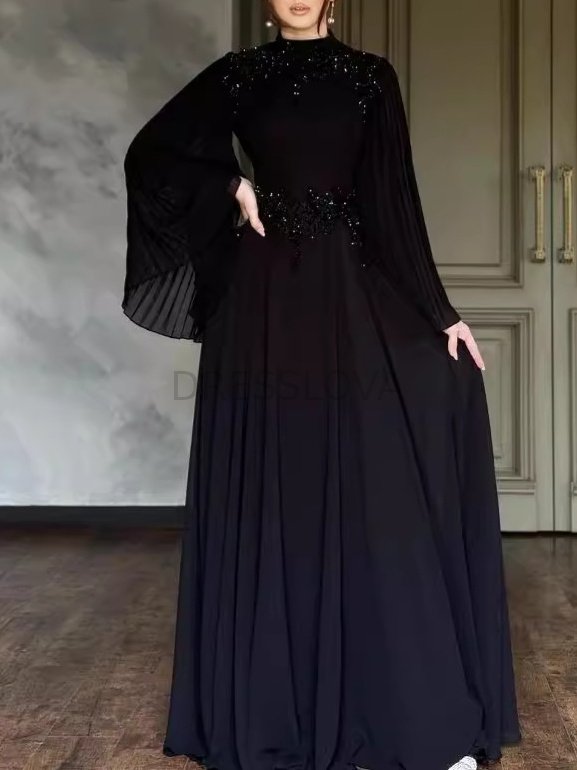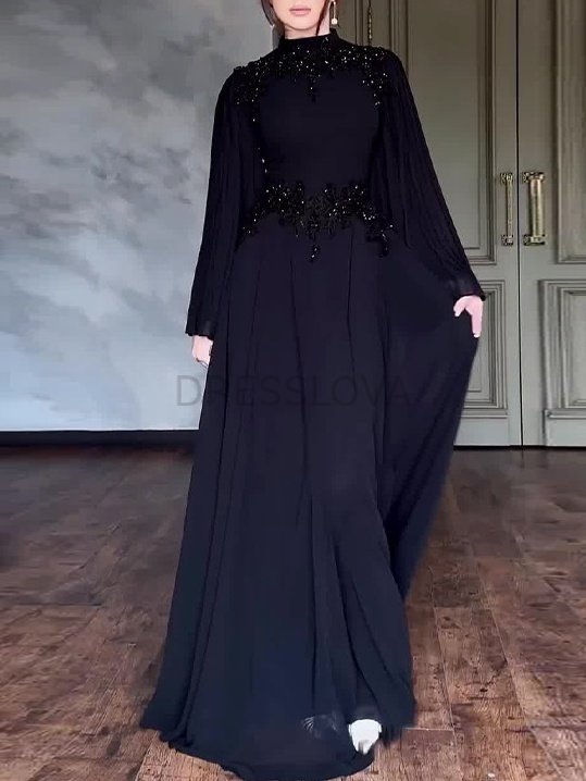 Crafted from polyester fabric, it feels smooth and comfortable while offering a structured, flowing silhouette. Its high neckline and embroidered beaded detailing make it the perfect choice for formal events or evening occasions